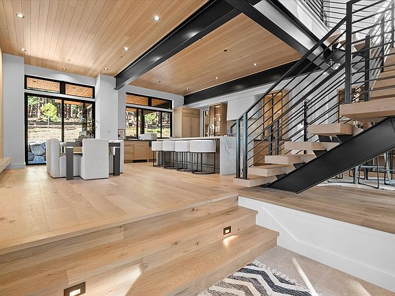 Modern Mountain Poise in Gray’s Crossing Tucked quietly against open space in the heart of Gray’s Crossing, this newly built mountain modern home brings together architectural steel, organic textures, and expansive glass to create a living experience that is both bold and effortlessly serene. A sculptural three-sided fireplace defines the main living level, separating the great room and dining area while preserving sightlines and natural flow. Wide-plank hardwood flooring, minimalist trim details, and custom steel accents lend a refined industrial edge, balanced by the warmth of natural light and forest views. The chef’s kitchen is equally artful and practical—outfitted with premium appliances, sleek cabinetry, and refined stone surfaces. A walk-in butler’s pantry with wine refrigeration adds functional elegance, while a dramatic glass-front wine display transforms storage into a design centerpiece. Three of the four bedrooms are en suite, each offering a private retreat with spa-like baths and tailored finishes. The primary suite features its own fireplace and a five-piece bath designed for relaxation, pairing freestanding soaking tub, glass shower, and dual vanities with clean architectural lines. Upstairs, a flexible loft space and dedicated bunk room extend the home’s versatility—ideal for media, office, or overflow guests. Seamless indoor-outdoor living defines the home’s connection to its setting. Large sliders open to expansive paver patios and a covered outdoor dining area designed for year-round enjoyment. A private nook at the rear of the property provides the perfect, sheltered location for a hot tub—surrounded by pines and evening quiet. The oversized garage offers tall doors and deep bays suitable for Sprinter-type vans and adventure vehicles, with generous storage for gear. The home is thoughtfully pre-wired for solar, generator, and air-conditioning, providing the infrastructure for sustainable comfort in every season. Every detail—from the Lutron lighting system and custom steel staircase to the natural palette of wood, glass, and stone—was curated to reflect the best of contemporary mountain design. At 11630 Bottcher Loop, form and function meet in perfect equilibrium: a home that lives as beautifully as it looks, embracing the forested calm of Truckee’s Gray’s Crossing while offering a striking expression of modern alpine architecture. At 11630 Bottcher Loop, modern architecture meets timeless Tahoe calm—a rare blend of form, function, and forest tranquility.