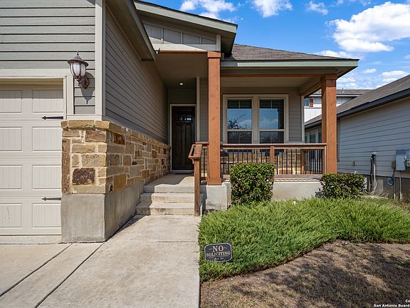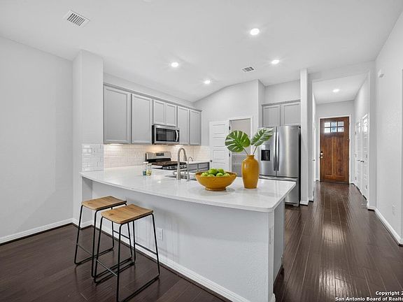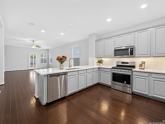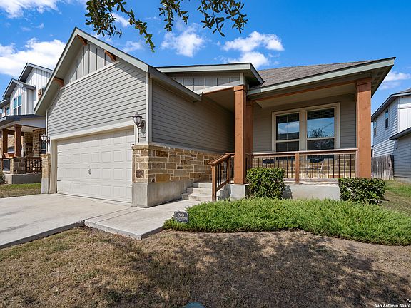 Set on a quiet cul-de-sac in the desirable Harlach Farms community, this beautifully cared-for Meritage home offers a blend of modern comfort and proven efficiency. Freshly painted inside and upgraded with brand-new carpet, the home feels crisp and move-in ready from the moment you walk in. A dedicated front study provides the perfect space for remote work, a library, or creative projects-separate from the main living areas for privacy and focus. The open-concept design connects the living room, dining area, and kitchen for an easy flow that suits both daily living and entertaining. A large island anchors the kitchen, surrounded by plenty of cabinetry, sleek counters, and stainless appliances. Durable wood-scraped flooring adds warmth and contrast to the fresh walls and new carpet. The spacious primary suite includes dual vanities, a walk-in shower, and a generous closet. Two additional bedrooms and a full bath complete the layout, offering flexibility for guests, family, or hobbies. Energy-efficient construction-Meritage's signature low-E windows, spray foam insulation which is helpful in keeping comfort high and costs low. Step outside to a covered patio overlooking a fenced backyard with trees, ideal for outdoor dining or relaxed weekends. The two-car garage adds extra storage, and the cul-de-sac location ensures minimal traffic. Harlach Farms residents enjoy access to a community pool, playground, and maintained common areas, creating a friendly and active neighborhood feel. Conveniently close to Loop 1604 and Highway 90, the location offers easy commutes to Lackland AFB, Citibank, Wells Fargo, and a wide range of shopping and dining options. For qualified buyers, this home includes an assumable VA mortgage-a valuable opportunity to take over existing favorable loan terms, subject to lender and VA approval. In addition, the seller is offering an attractive concession toward closing costs and/or an interest rate buydown when using NextMortgage! Why buy new? This home shines just as bright, shows like new inside, and is priced better-with the upgrades, efficiency, and community amenities already in place. Move-in ready, beautifully maintained, and full of smart value, 11631 Troubadour delivers the best of southwest San Antonio living.