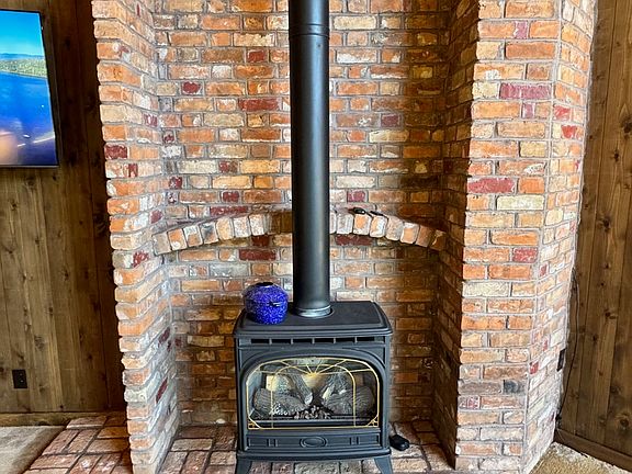 Pool table, wet bar, wood-burning fireplace, and wood storage room