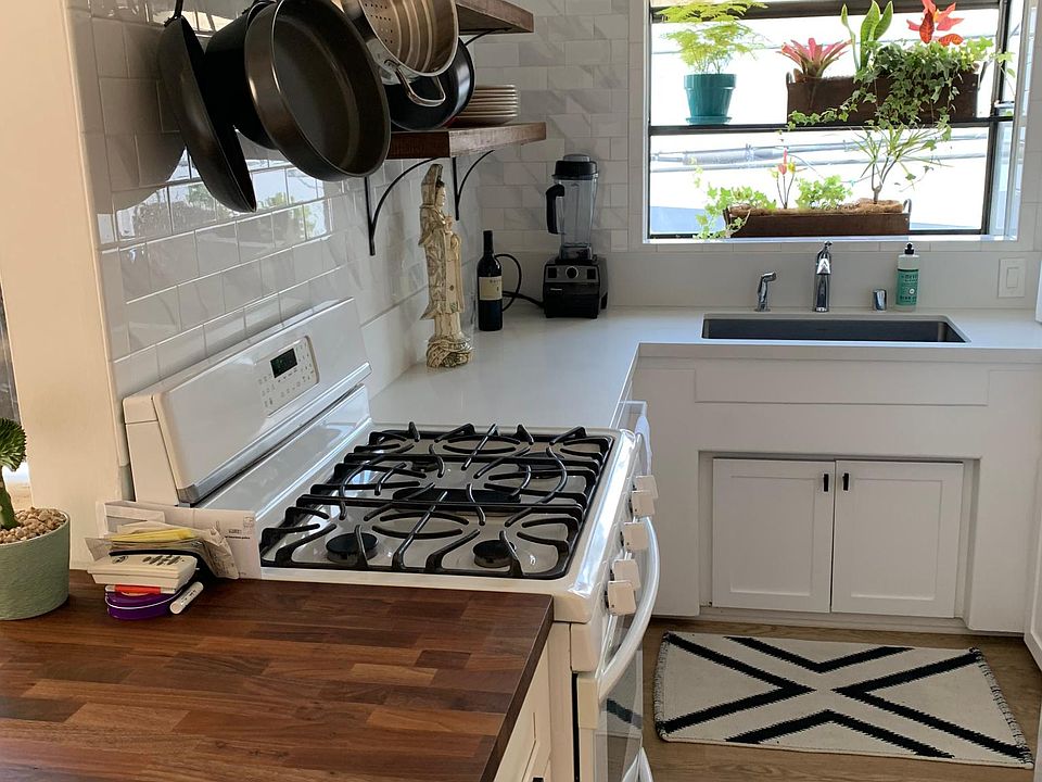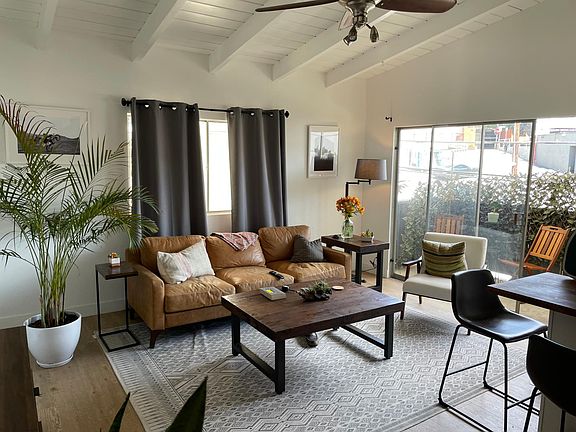 This recently upgraded 2 bedroom/2 bathroom condo has an ideal configuration for sharing with a roommate, for a small family or for accommodating guests. With a large open floor plan and unique high vaulted ceilings, this is a nicely laid-out end unit that shares only one common wall in the guest bedroom while having no one above or underneath you. Below the unit is the common area laundry room but unlike most other condos in the building, there are washer and dryer hook ups inside. The unit features a kitchen with a stainless steel sink, white quartz counter tops and white subway tiles that surround the entire kitchen wall. One bathroom was recently totally renovated with a new glass standing shower with tile throughout. The building, a two story complex with 11 total condos in the community, also has a secured gated entry. Within walking distance is Whole Foods, Starbucks, Coffee Bean, multiple restaurants, bars, shops, Orange Theory and it is less than a mile from UCLA. Owner pays for water. Tenant pays other utilities. Unit comes with 1 parking spot and ability to get permit for street parking.