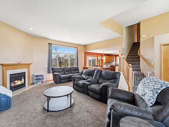 Welcome to this beautifully updated home, perfectly situated on over a half-acre lot with serene pond views. The main level is open, bright, and airy, with tall ceilings in the foyer and living room that create an inviting atmosphere. A cozy gas fireplace adds warmth to the living area, making it the perfect place to relax. The spacious kitchen is a chef’s dream, featuring Mission-style cabinets, sleek granite countertops, a large center island, and high-end stainless steel appliances. The main level also offers a convenient laundry room, a half bath, and a private office with French doors, ideal for work or study.