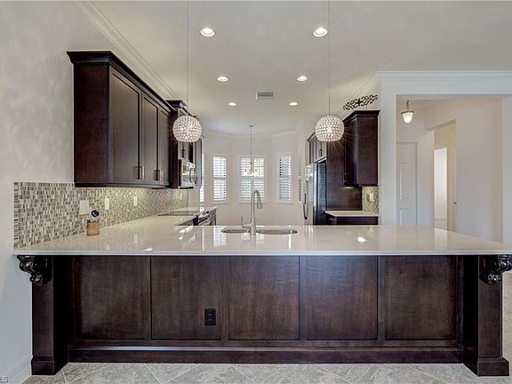 ABSOLUTELY GORGEOUS SINGLE FAMILY HOME FOR SALE IN MARINA BAY. This is the BEST FLOOR PLAN available in the community. It features a HUGE GREAT ROOM-DINING-KITCHEN OPEN CONCEPT with SOARING CEILINGS and upgrades that impress even the most discerning buyers! Light pours through the large windows all day. The home has Southern exposure perfect for watching sunrises and sunsets from your screened lanai overlooking a sparking lake. The backyard is fenced and the tropical landscaping highlights the mediterranean architecture of this AMAZING HOME. IF YOU ARE LOOKING FOR A LARGE, STUNNING KITCHEN, LOOK NO FURTHER. Quartz countertops are the perfect accent for the rich wood cabinets, tile backsplash, stainless steel appliances and modern fixtures. The breakfast nook has a fabulous bay window that gives this home so much character. Neutral tile floors laid on diagonal extend throughout the living space with plush carpet in the bedrooms. The modern touches are what set this home apart from all rest. This home offers so much value perfectly balanced with style. Marina Bay gives residents resort-style amenities, beautiful grounds, gate house security and a neighborhood full of possibilities.