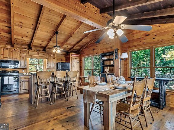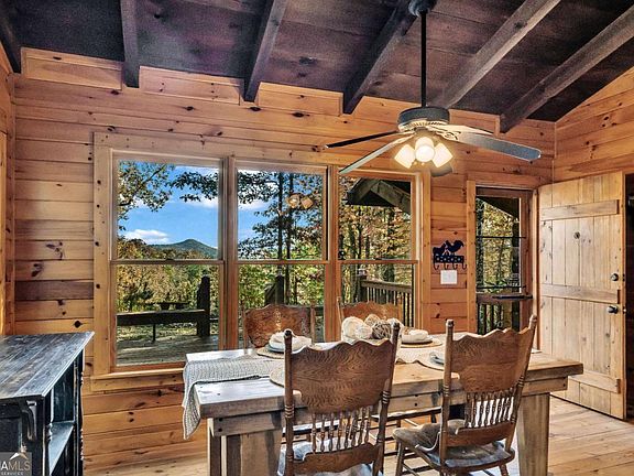 This charming 3-bedroom, 2-bathroom ranch-style log cabin has been lovingly cherished for many years, serving as the heart of countless memories. Nestled on just over 4 acres-a rare find in this area-it offers an exceptional sense of space and tranquility. Throughout the home, vaulted cathedral-beamed ceilings enhance the rustic charm and create an airy, open feel. The open-concept kitchen features an electric range, an eat-at center island, stone countertops, and rich wood-stained cabinets, flowing seamlessly into the dining area where sweeping mountain views provide the perfect backdrop for any meal. The spacious living room, anchored by a stunning floor-to-ceiling stone wood-burning fireplace, exudes warmth and comfort, while an adjoining sunroom leads to a screened-in porch and back deck, ideal for relaxing and taking in the breathtaking 90 long-range mountain views. A charming window seat between the kitchen and living room provides a peaceful nook to unwind. Outdoor living is equally inviting with a cozy fire pit, a large patio for entertaining, and bonus storage space beneath the deck. With a durable metal roof, this fully furnished, move-in-ready home blends comfort, character, and scenic beauty-just minutes from the North Carolina line, Mineral Bluff, and downtown Blue Ridge. Schedule your showing and experience this beautiful home for yourself!!
