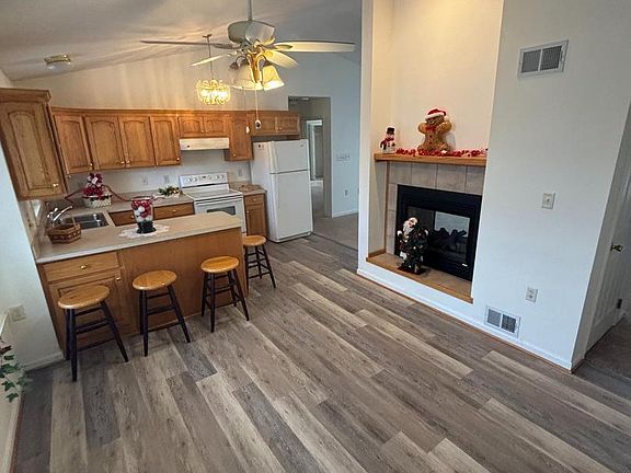 Double-sided propane fireplaceKitchen with bar areaFlat rear lotDining area