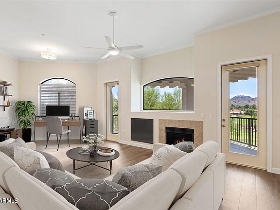 Enjoy beautiful golf-course and mountain views from this lovely 2-bed, 2-bath condo. The interior features tall ceilings, a cozy fireplace, wood-style flooring and tons of natural light. Recent updates include new A/C (2023), new H/W heater (2022), plus new flooring, paint, main shower and tub surround, select faucets, select lighting, refrigerator and washer/dryer (2024). With its stunning mountain views, the private balcony is perfect for morning coffee or relaxing afternoons. Located next to the new PV development, you'll have quick and easy access to shopping and restaurants, including Whole Foods, Costco, Target, Sprouts and more. Community amenities include a fitness center, pool, spa and walking trails. Unit comes with 2 garage parking spaces next to elevator. Move-in ready!