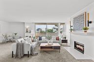 Private balconySleek gas fireplaceContemporary lightingWhite shaker-style cabinetryQuartz-style countertopsOversized windowsMatte black fixtures