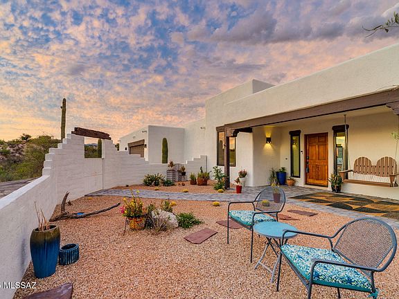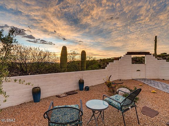 Rare Opportunity in Saguaro Trails-Gated Luxury Living on 3.33 Acres! Nestled within the top-rated Vail School District. Situated on an elevated 3.33-acre lot, this beautifully renovated home offers breathtaking panoramic views of the mountains, sunrises, and sunsets. Step inside to discover engineered hardwood floors throughout (no carpet!), tastefully remodeled hall and powder baths, and a spacious primary suite featuring a cozy gas fireplace, private patio access, and a large walk-in closet. The open-concept great room with soaring vaulted ceilings and a second gas fireplace flows effortlessly into the kitchen, complete with stainless steel gas appliances, a breakfast nook, and a formal dining area. Enjoy added flexibility with a large bonus room-perfect for guests, office, or studio- complete with a Murphy bed, private entrance, and its own heating/cooling system. Upgrades include new Andersen windows, new pavers in the front courtyard and backyard, new turf and irrigation, two new HVAC systems (installed 2/2025), new water heater, and a freshly recoated roof (2023). The sparkling pool with removable safety fencing completes this move-in-ready gem. Enjoy privacy, views, and upscale desert living in this exceptional home! Playset, front porch swing & 1 planter does not convey.