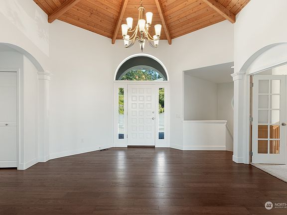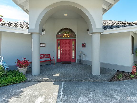 A showcase home! Discover views of the San Juans, Olympics & sunsets from almost every area. Admire the exquisite vaulted wood ceiling foyer, arch doorways & luxe living spaces—all on main level, including guest suite, 3rd bdrm/office, wet bar, dining & living rms, each w/ statement fireplaces. Indulge in the well-equipped kitchen w/breakfast nook. Lower level offers laundry+storage, serene primary suite with water vistas, reading or work-out area, en-suite with walk-in shower, built-ins & private hot tub deck. Outside, mature landscaping & fenced yard ensure privacy, oversized 3car garage with brand-new floor beckons all kinds of enthusiasts. Plus, enjoy membership to the best sandy beach on the island. This is island living at its finest!