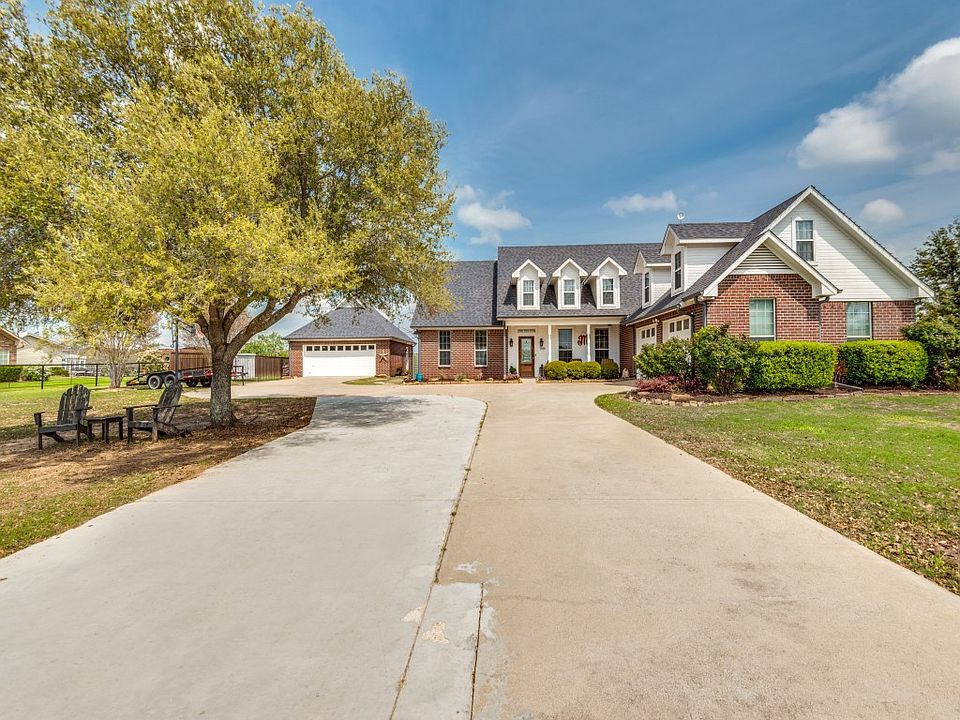 Nestled on almost 2 acres of picturesque property, this meticulously maintained home offers an unparalleled waterfront lifestyle. Enjoy a private pool, a charming covered patio, a 2-car attached garage, and a bonus detached garage—perfect as a man cave or workshop. The man cave features a glass overhead door that opens up to breathtaking pond views, creating a seamless connection between indoor and outdoor spaces, ideal for relaxation and entertainment. The backyard is securely enclosed with a new iron fence, perfect for pets or children to enjoy the space safely. Inside, the spacious living room, kitchen, and dining area are thoughtfully designed to highlight the beauty of the outdoors, with expansive windows that invite natural light and offer sweeping views of the tranquil pond and inviting pool. The dining area, with its floor-to-ceiling windows, frames the serene backyard oasis, making every meal feel like an experience in paradise. The master suite is spacious, offering a large walk-in closet, separate vanities, and a separate tub and shower for ultimate comfort and convenience. Various updates throughout the home, including roof, gutters, fencing, water heater, AC unit, epoxy flooring in garages, paint, refrigerator, microwave, pool plaster, pool equipment and dock make this property move-in ready and even more appealing! Indulge in the serenity and luxury of waterfront living, where every day feels like a getaway. This exceptional home offers the perfect blend of comfort, beauty, and functionality—don't miss the chance to make this waterfront retreat your new home. Schedule a viewing today and see it for yourself!