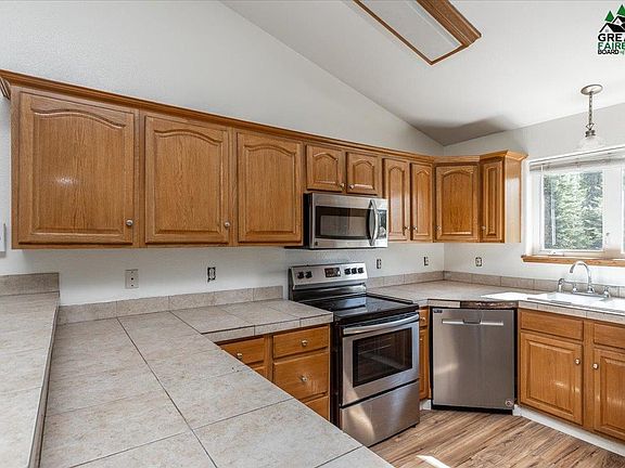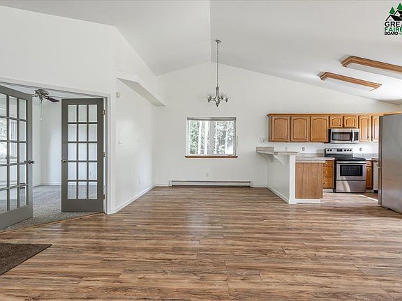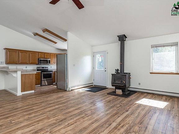 Step inside to discover the heart of this home—a spacious and thoughtfully designed floor plan adorned with high vaulted ceilings, open concept common space, and a cozy wood stove. The kitchen is a culinary haven, featuring a stylish breakfast bar where you can savor your morning coffee while planning your next Alaskan adventure. Stainless steel appliances, ample storage, and a well-appointed layout make this kitchen a chef's delight. The counter tops are scheduled to be replaced soon and will add even more style and value. The master large suite includes a double vanity complete with modern fixtures and a walk-in closet. The additional three bedrooms provide versatility and comfort for your family and guests. There is also a fifth bonus room you can use as an office, gym, hobby room, or for other purposes. And the garage is oversized with three stalls and plenty of space for ample storage space to accommodate tools, equipment, and outdoor gear with ease. Venture outside to the generous yard, where endless possibilities await. Located just moments away from Ft. Wainwright's back gate, this property offers easy access to the base and nearby amenities, ensuring a convenient and seamless lifestyle. Don't miss your chance to make this house your home. Welcome home!