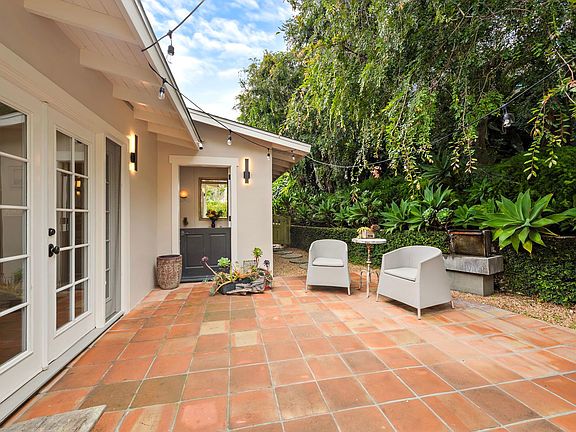 The backyard "treehouse" deck is an entertainer's dream, nestled under a mature Chinese elm and offering both ocean and mountain views. The space includes a fire pit table, lounge seating, a dining table with seating for 12, a gourmet grill, and a professional-grade paella burner with pans.