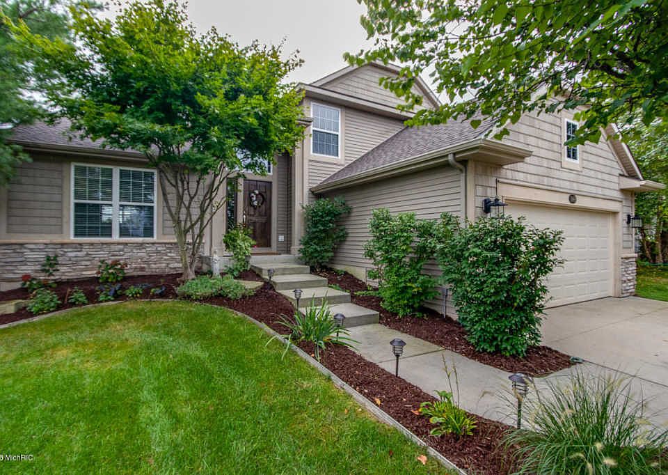 Imagine living in 200 acres of natural preserves w/peaceful waterfront views, walking trails, access to boat launch, next to a wonderful park and just a stroll into the Village of Ada. This beautiful meticulously maintained home is ready for you in Ada Moorings. Walk into a two story foyer open to the living room/dining room. French doors into the spacious eating area into the kitchen. Kitchen features custom cabinetry, high end stainless appliances, New quartz counter tops with new under mount sink with garbage disposal. Slider off eating area out to a two tired huge deck and private yard. Hardwood floors throughout the main level, dramatic ceiling, plush carpet and so much more! Kitchen is open to the Huge family room just off the main level with gas fireplace, plus bedroom/office,