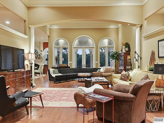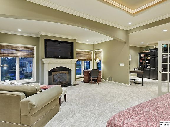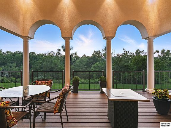 Experience luxury in this 2-bed, 3-bath home with captivating curb appeal and a 4-car garage. Just 12 minutes from N. Omaha! Inside, 14 ft ceilings define the main living area with a cozy fireplace. The gourmet kitchen features high-end finishes, an island and a formal dining area. The home's elegance also includes granite countertops throughout. The primary suite is your private sanctuary with refined tray lighting, a seating area, a fireplace, a private patio and walk-in closets. One closet includes a sink, mini-fridge and microwave; the other, a built-in iron. The spa-like bath offers a fireplace by the tub, double sinks and a gorgeous tiled walk-in shower. The unfinished lower level features rough-ins for a fireplace, bath, wet bar and laundry room. Also included is a storm room and a 1-car garage. Outside you can enjoy the full-length deck, perfect while overlooking the gorgeous backyard, which is framed by a treeline. This property truly embodies comfort & elegance. Welcome home!