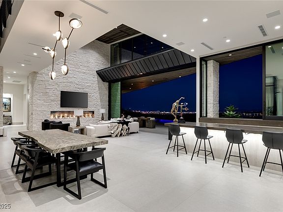 Architectural desert modern masterpiece set back from the street with grand approach & striking curb appeal. Walls of glass frame spectacular golf, mountain, lake & direct Strip views—seamlessly blending indoor/outdoor living where nature becomes art. Private-entry casita w/kitchenette & bath—ideal for guests, multigenerational living or luxe office. Great room features soaring ceilings, dramatic lighting, formal dining, sleek bar & chef’s kitchen w/ custom cabs, waterfall island, pot filler & built-in espresso machine. Glass wine cellar displays hundreds of bottles in climate-controlled gallery-style. Main-level primary suite offers patio access, personal laundry, steam valet closet & spa bath w/ steam shower & plumbed for tub. All baths feature walk-in showers. Upstairs media room w/ bath & ar offers flexible use as gameroom, gym or studio. 6 oversized garage bays plus add'l parking. Lap-sized pool w/ water feature. Sits on one of the most prestigious lots in desirable The Summit.