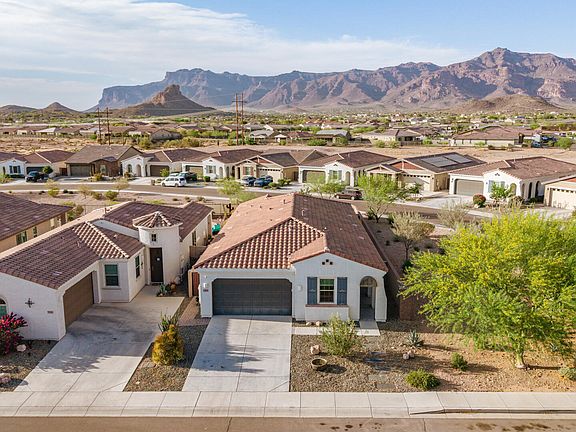 IMPROVED PRICE! Experience breathtaking mountain views, effortless desert living, and endless outdoor adventure in this beautiful move-in ready rambler in Peralta Canyon! This open-concept home features fresh exterior paint, soaring 9-ft ceilings, and a spacious great room perfect for relaxing or entertaining. Wake up to stunning SUPERSTITION MOUNTAIN VIEWS! The private, spa-inspired primary en-suite features an UPDATED bathroom, walk-in closet, linen storage, and recessed cabinetry. The entertainer's kitchen shines with granite countertops, a center island, stainless steel appliances, tall cabinets, and a walk-in pantry. Enjoy year round outdoor living in your low-maintenance backyard retreat—complete with an extended covered patio with Solara adjustable pergola, firepit, fully fenced yard, and Astroturf dog run. The 2-car garage includes overhead storage racks for added convenience. Set on a PREMIUM CORNER LOT, this home is part of a vibrant community with pickleball and sport courts, playgrounds, BBQ areas, walking trails, and more. Just minutes from Hwy 60, top-tier golf, biking, and world-class hiking at Peralta Trails Regional Park, plus walking distance to Peralta Elementary. Excellent lock-and-leave home! Don't miss your opportunity to own this desert gem!!