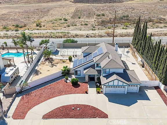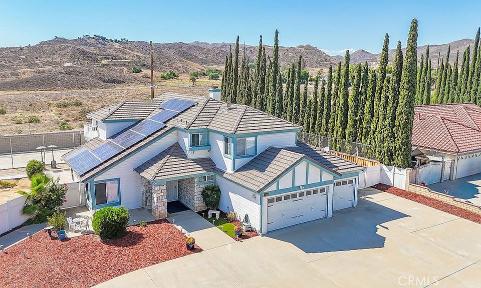 WELCOME HOME to this spacious 5-bedroom, 3-bath residence nestled on a half-acre lot in a peaceful Moreno Valley neighborhood. As you arrive, you’ll appreciate the low-maintenance landscaping, large circular driveway, RV parking, and three car garage. Step through the double doors and be greeted by BRAND NEW LUXURY VINYL PLANK FLOORING that flows seamlessly throughout the 3,321 sq. ft. home. Soaring ceilings allow natural light to fill the open spaces, enhancing the freshly painted interior and new window blinds. The kitchen has been updated with new stainless steel appliances, including a dishwasher, oven, microwave, and gas range. Conveniently, one bedroom and a full bath are located downstairs, while upstairs you’ll find three additional bedrooms plus a generous primary suite. The primary bedroom features access to a private outdoor deck spanning nearly the entire back of the home. Below the deck, enjoy approximately 678 sq. ft. of covered outdoor living space perfect for year round entertaining! The backyard is a true retreat with its own tennis and pickleball court, a one mile walking track, planter boxes, fruit trees, and an oversized shed that could serve as a man-cave or she-shed! Additional benefits include a PREPAID SOLAR lease until 2037, NO HOA, LOW TAXES, and a PRIME LOCATION close to shopping, schools, and commuter-friendly freeways. Don’t miss the opportunity to make this beautiful home yours! SCHEDULE A SHOWING TODAY!