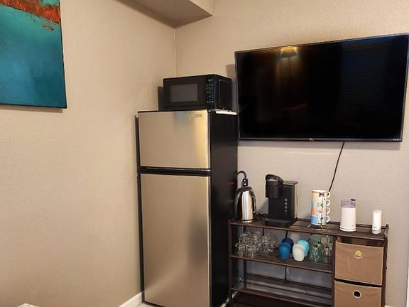 Kitchenette with 2 burner plate, air fryer , coffee staion, microwave and apartment size fridge.