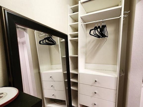 Dining spaceLarge studio unitLots of storageLarge bathroom