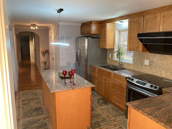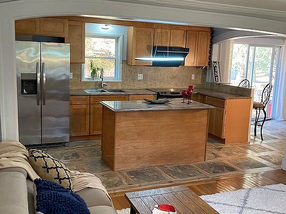 Modern fireplaceKitchen with new cabinetsBeautiful white brick wallGranite countertopsNew stainless steel appliancesIsland and a barHuge mirrors