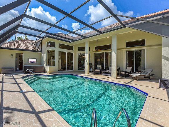 Discover the charm of Mahogany Run in Gateway, a coveted community ideally located near RSW Airport, shopping centers, entertainment venues, restaurants, and Fenway Park South Stadium. Step into your stunning 4-bedroom, 3-bathroom home and be greeted by an expansive dining/living room that offers picturesque views of the luxurious pool area. The home features tile flooring and high ceilings, creating a spacious, modern ambiance. The remodeled kitchen showcases custom white shaker cabinets, granite countertops, a marble backsplash, an island with a breakfast bar, under-cabinet lighting, and a built-in pantry with slide-out drawers. A sizable family room and breakfast nook with sliding doors provide delightful views of the pool. The home's right wing includes three bedrooms and two updated bathrooms, one of which is conveniently accessible from the pool. On the left side, find your private sanctuary featuring a carpeted, oversized bedroom with dual walk-in closets and an ensuite bathroom equipped with a soaking tub, tiled shower, water closet, and dual sinks, all recently enhanced with new vanities, granite countertops, updated shower, plumbing fixtures, and tile flooring. The roof was replaced in 2017, the HVAC system in 2019, and the hot water heater in 2023. Plantation shutters and blinds have been added to the windows and sliding glass doors, respectively. Additional updates include new lighting fixtures, ceiling fans, a front door, a hot tub, and a 220-volt outlet in the garage for electric vehicle charging. This home is prepared to welcome you and your family—don't let this opportunity pass by.