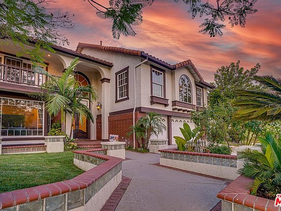 Luxuriously designed, this Porter Ranch residence exudes effortless style. Fitting for any sophisticated lifestyle, a grand chandelier in the foyer welcomes you inside the impressive layout. The living room and formal dining area to an abundance of natural light where guests can gather around the fireplace, or dine under the mirrored ceilings that vertically expand the space. Designed for the home chef, the kitchen showcases stainless steel appliances, granite countertops, floor-to-ceiling cabinetry for your cutlery, plus a breakfast nook. Cozy up by the fireplace for a comfortable ambiance to unwind in while recessed lighting and exposed wood beams add eye-catching detail from above. Upstairs, supreme comfort awaits you in the generously sized master suite with high vaulted ceilings, a sitting area with another fireplace and a luxury 4-piece bathroom. Spend memorable summers in the backyard where you can take a refreshing dip in the pool and spa shaded by mature palm trees for extra privacy. Lush landscaping can be seen from the other outdoor areas, including the pergola-covered patio and the built-in BBQ bar, ideal for any avid entertainer. Additional features include a laundry room and an attached three-car garage. Recently insulated expandable attic with built-in storage space can use for multiple functions.