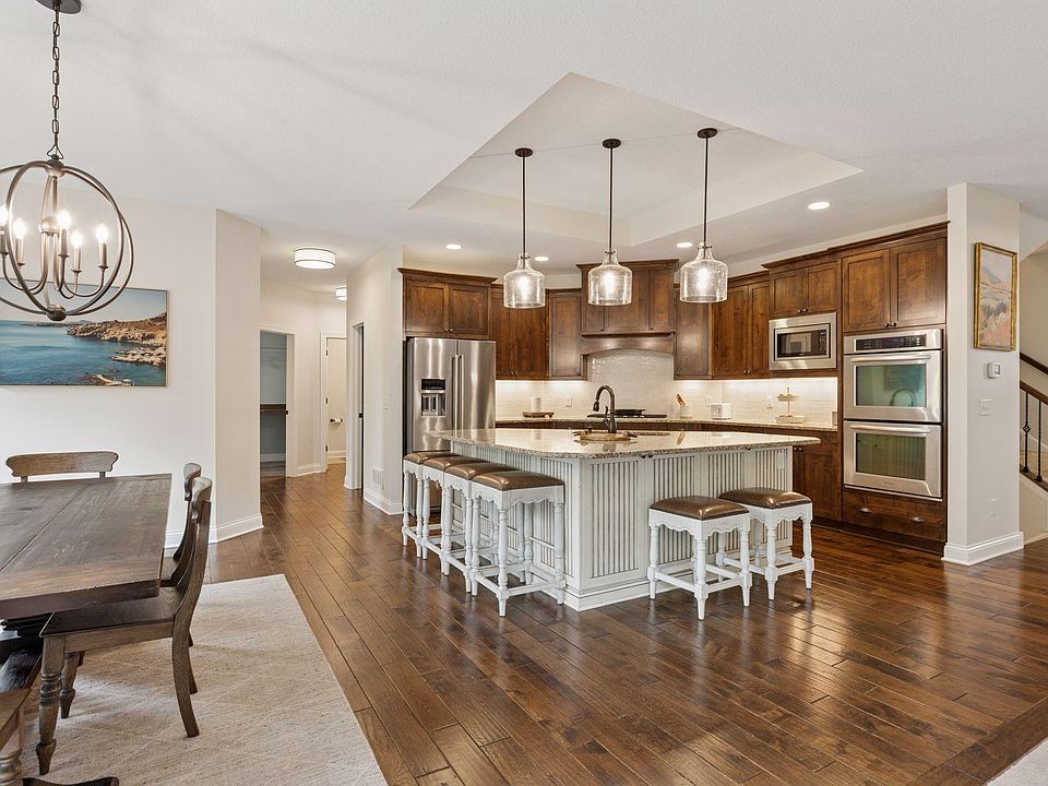 This stunning home built by McDonald Construction is located on a quiet cul-de-sac in the highly sought-after 196 school district. From the moment you arrive, you’ll be impressed by the gorgeous landscaping and welcoming curb appeal. Step inside to find rich wood floors, stone countertops and an open main level filled with natural light. The heart of the home is the expansive gourmet kitchen, featuring a massive center island, walk-in pantry, stainless steel appliances, and custom cabinetry. The main level includes a private office, flex homework space, and an oversized mudroom. Upstairs, you’ll find 5 bedrooms, including a luxurious primary suite with reading nook and spa-like bath. The remaining 4 bedrooms are connected via Jack-and-Jill baths for convenience. The walk-out lower level is an entertainer’s dream with a wet bar, gas fireplace, and open layout. Step outside to a beautifully landscaped yard with a large patio, deck, outdoor kitchen and stone fireplace! This is the one!