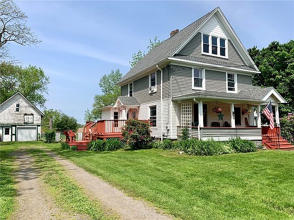 You will love everything about this huge 3 bedroom, country Colonial with 3 separate porches and original 1890 farmhouse charm throughout. Beautifully updated with grey and white vinyl siding and newer windows. Newer hot water heater. Roof 12 years old. The first floor has a large entry foyer with freestanding pellet stove and gorgeous staircase. To the left is a formal living room, dining room and small office with half bathroom. Through the dining room is the large country kitchen with attached laundry room and bonus attached outhouse! Could be used for storage or for those backyard parties. Accessible to the back porch and fenced in yard area. The 2nd floor has a spacious and bright full bathroom and 3 newly carpeted bedrooms. The attic has full walk up stairs and lots of storage space. Outside there is a large barn with workshop area, room for cars and huge 2nd floor. Kendall School district. Public water and septic.