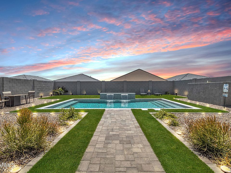 The real showstopper is outside. The backyard was built for entertaining with a sparkling pebble tec pool featuring a water feature and color changing lights, creating the perfect ambiance for evening swims or weekend get togethers. Surrounded by low maintenance turf and desert landscaping, the oversized yard offers plenty of room for lounging, games, or hosting unforgettable gatherings.
