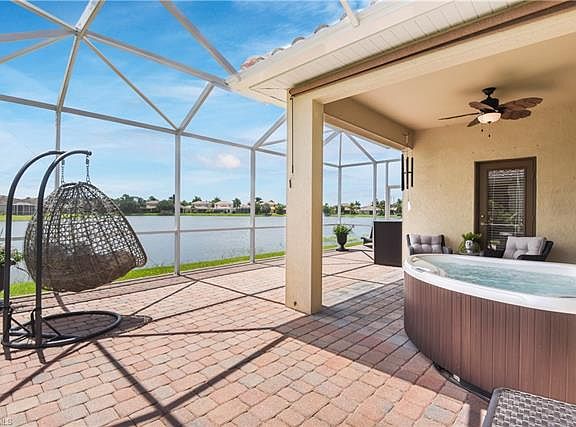 Stunning lakefront single family home in gated community! Wonderful open floor plan with lots of natural lighting, volume ceilings accented with crown molding, upgraded 20"x20" tile set on diagonal in main living areas, new high-end Pergo flooring in bedrooms, a spacious kitchen design w/ eat-in area, and a split bedroom layout. From the first step into the home thru the elegant glass door entryway to the peaceful lake view from the screened rear lanai, this home offers a cozy & comfortable feel. Recently updated (see MLS attachment w/ full list)- gutters on entire perimeter of home, outdoor lighting, retractable screen door at front entry along w/ blind, lock & doorbell, new extended rear lanai w/ screen cage & open lanai w/ pavers, high toilet in guest bath, paddle fans & new light fixtures, and a renovated kitchen featuring a new faucet, disposal, high-end appliances, dimmer switch and tile backsplash. Located in Olympia Pointe, situated right on Fort Myers/Lehigh Acres line, it is a gated community w/ affordable HOA fees that covers the lawn care costs & all of the amenities- community pool & spa, kiddie pool, playground, exercise room, and billiards room.