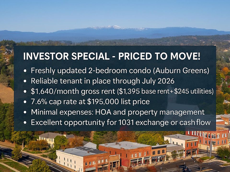 ***Investor Opportunity - Turnkey Cash Flow in Auburn Greens!*** Don't miss this fully leased 2-bed, 1-bath condo in desirable Auburn Greens. Freshly updated with new flooring, paint, and appliances at the last turnover and offering instant income from Day 1. Currently rented at $1,640/month (base rent $1,395 + $245 utility reimbursement), this property delivers a strong 7.6% cap rate at the $195,000 list price with ultra-low expenses (only HOA + professional management). Net income of ~$14,844/year with a dependable tenant in place through July 2026, making this an ideal set-it-and-forget-it rental or 1031 exchange replacement. Seller prefers to keep trusted Huber Property Management on board post-sale to ensure seamless continuity. Great location, great numbers, and hassle-free ownership. This is the investor's trifecta. Submit your offer today before it's gone!
