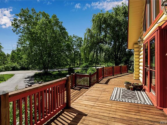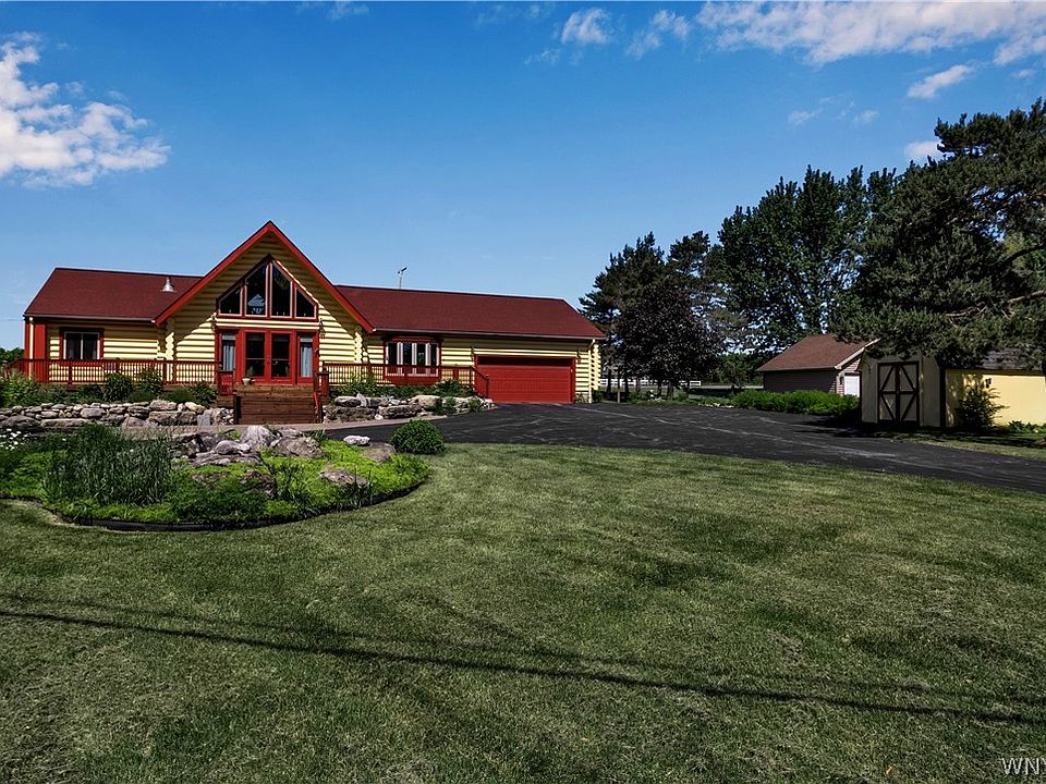 Luxurious log home, crafted for the enjoyment of living! VR Pricing: Seller Will Consider offers starting at $370,00-$400,000+. Grand double entry leads you into 2 story great room with fireplace and overlooking loft. Case opening into gathering sized dining room and kitchen with tin ceilings. Kitchen is outfitted for ease of cooking with a Wolf stove, farmhouse sink, french door refrigerator & convection, halogen, microwave speed oven. There are 2 bedrooms, 2 baths & laundry on the main level. The primary bedroom en suite bath captivates you with its stunning copper soaking tub and beautiful slate lined shower! Loft with skylights & 360 degree view! Basement area is largely finished with tall ceilings, wet bar, 3rd full bath of the home, & 2 unfinished storage areas. Perfect guest/in-law suite! Here, there is no light pollution. Sit on the deck or patio counting the stars or watching fireflies as you enjoy the warmth of the firepit. Friendly neighborhood & lovely landscape with circular driveway, attached heated 2 car garage, & garden shed. Brand new Furnace & HWT '24! TEAR OFF Roof '17! Ownership of land across the street with creek running through it! Alden Schools.