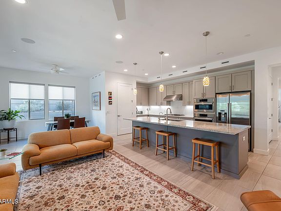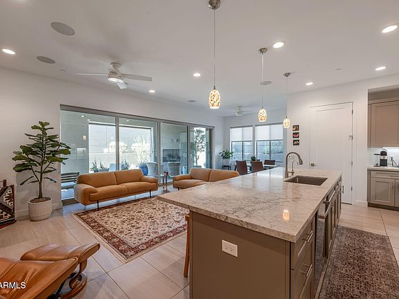Modern Interior design meets luxury living in this single-level townhome at The Reserve Scottsdale. Built in 2022, this home features a bright open-concept great room, elevated ceilings, 18''x36'' porcelain tile throughout, and gourmet kitchen with Bosch stainless appliances, shaker cabinetry, and an expansive kitchen island. A dramatic 20-ft pocket slider opens to a sprawling covered patio w/ fireplace for seamless indoor-outdoor entertaining. There are 2 master suites providing outdoor access and walk-in showers, along with a den that opens to the courtyard w/ 2nd fireplace. Additionally, there are 2 RO systems (kitchen and laundry room sink), tankless water heater, security system, and ample cabinets for storage. HOA includes water, sewer, garbage, heated pool/spa, gated entrance & more