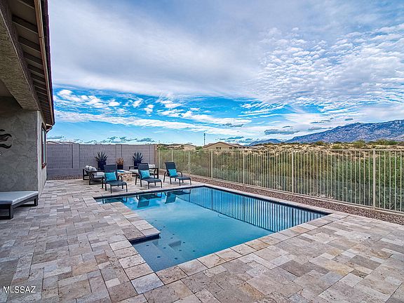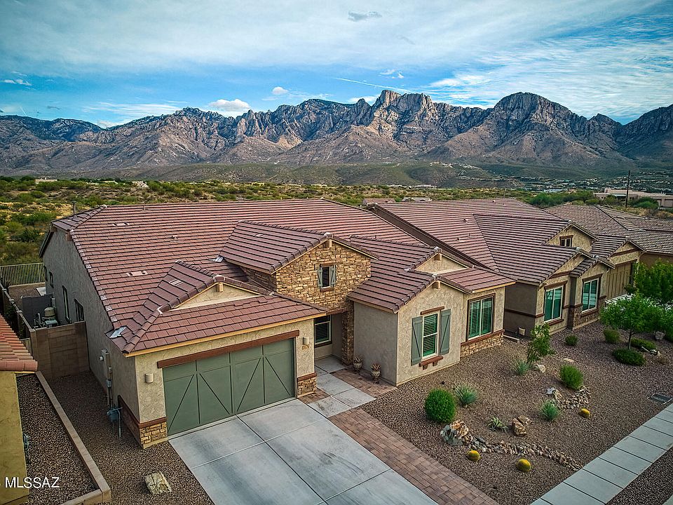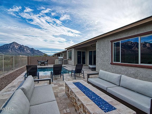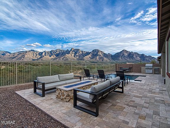 Absolutely stunning 4BD/2.5BA (3045 sq ft) home with pool/spa & breathtaking mountain views in the Villages of Silverhawke community. The exceptional views of the Catalina Mountain, visible from anywhere in the backyard, will not disappoint. Whether in the spool, utilizing the built-in BBQ grill, or relaxing by the gas fire pit, the backyard is truly resort style living. The interior is spectacular with GE Cafe style appliances, featuring a fridge with a built-in Kerig. The split floor plan home is perfect for entertaining with a media area and beverage center. Work up a sweat in the exercise room. You also have a 3-car tandem garage, and a laundry room w/ wash basin. This is the home to see in Oro Valley.
