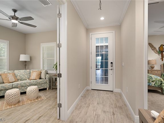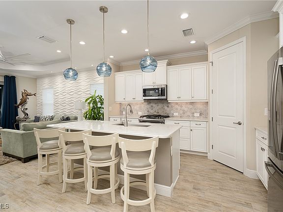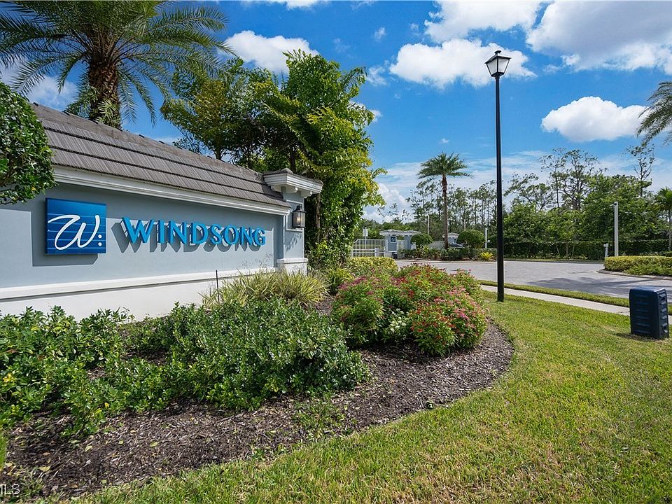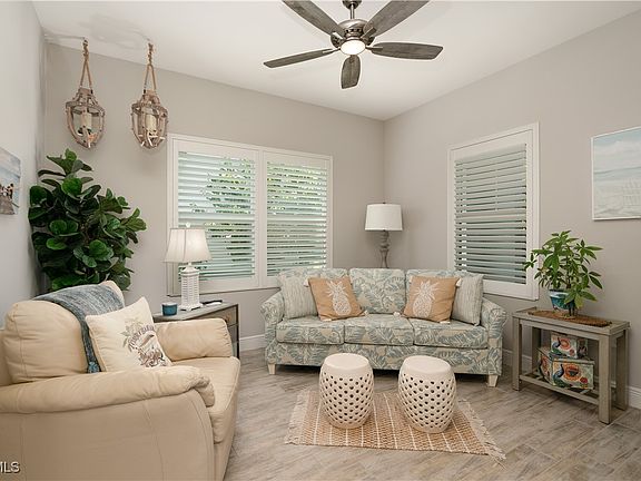 Beautifully upgraded 2-bedroom plus den, 2 bath home with over 1,600 sq ft located in the desirable Windsong community of Fort Myers. The gourmet kitchen is a standout, featuring a natural gas stove, stone backsplash, blown glass pendant lighting, and a walk-in pantry with custom built-ins and an additional AC vent designed to prevent mold and mildew, keeping the pantry fresh and reducing spoilage. Just off the kitchen, the inviting open-concept dining/living room offers abundant natural light, coordinating accent walls with customized wall décor on one and the other highlighted by five dimmable spotlights, and a 65” smart TV with soundbar, the perfect blend of style and functionality. The large master suite includes plantation blinds, a custom barn door divider, dual closets, and a spa-inspired bath with marble counters, a walk-in shower, and upgraded fixtures. The guest bedroom/den offers plantation shutters, French door shades, a ceiling fan, and a mounted TV with a sound system. The laundry room features additional cabinetry, glass backsplash, stone counters, a premium washer, and a natural gas dryer. The garage includes an epoxy floor finish along with garage shelving and electrical wiring for a portable generator, plus retractable screens at both the garage and entryway. Outdoor living is highlighted by a spacious screened lanai with water view, upgraded fan, additional outlets, remote-control hurricane shutters, natural gas outlet for grilling, and dual sliding hurricane-rated glass doors that extend seamlessly from the living room. Additional features include a whole-house Kinetico water filtration system, updated landscaping, exterior storm shutters, a freestanding natural gas water heater, and recent roof inspection and repairs by the original contractor. Windsong residents enjoy a beautiful community pool, clubhouse, and dog park. This community is located in Flood Zone X, with an elevation over 18 feet, and has experienced no flooding during recent hurricanes. It offers low HOA fees that include cable and high-speed internet, and has no CDD. This home is truly one-of-a-kind in both design and detail — unlike anything else on the market — offering a rare opportunity to own a residence that is both beautifully finished and thoughtfully upgraded.