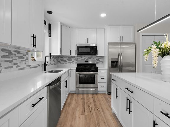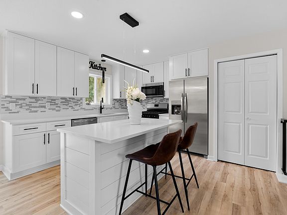 Discover this beautifully renovated split entry home featuring modern upgrades throughout, nestled in a tranquil neighborhood. Rarely does a renovation of this caliber and style come along. A true “to the studs” renovation with top quality materials. New roof, concrete driveway, windows, siding, AC unit - Be sure to check out supplements for an extensive list. The main level boasts an open-concept living area with luxurious vinyl flooring and oversized windows that flood the space with natural light. Brand new kitchen features stainless steel appliances, quartz countertops, and custom cabinetry. Enjoy the serenity of this quiet, family-friendly neighborhood while being just minutes away from schools, shopping, and dining. This one is a must-see, better than new! Don't miss the opportunity to make this stunning home yours!