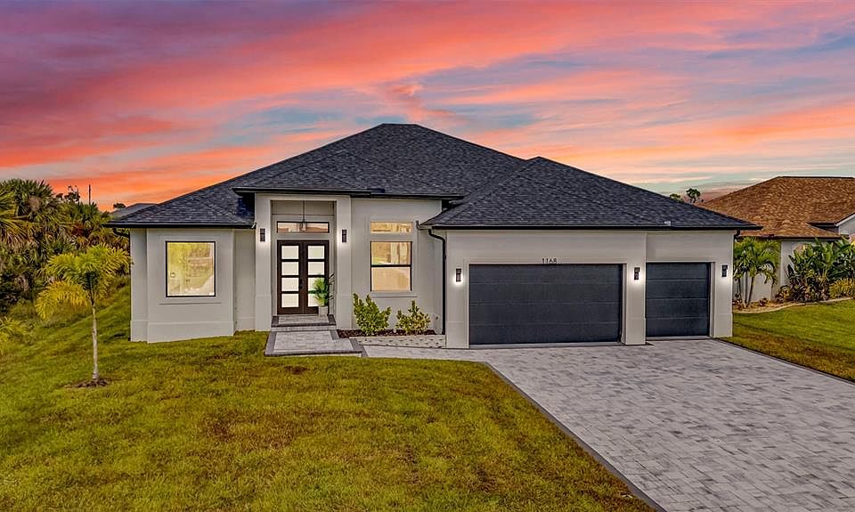 Stunning brand-new luxury custom home in desirable Pine Valley Rotonda West. This 3-bedroom, 3-bath home with a 3-car garage and bonus room offers exceptional craftsmanship, timeless style, and maximum hurricane protection. Set on a peaceful canal, this home combines modern luxury with serene Florida living. Enjoy an unbeatable location just minutes from Rotonda’s five golf courses, the Cape Haze Pioneer Trail, and the pristine Gulf beaches of Boca Grande and Placida. Must see to appreciate the attention to detail in every aspect of construction and design. Built on a stem wall, elevation of 9.2 feet, stucco and block construction, featuring full impact-resistant windows, doors, and garage doors for complete peace of mind. The exterior is enhanced by a 3-dimensional architectural shingle roof, brick paver driveway, epoxy-finished garage floor, and closed soffits and fascia. Spray foam insulation and high-efficiency HVAC ensure energy savings year-round. The backyard oasis includes a 28’ x 14’ Pebble Tech pool with a Hayward heat pump, top-quality pool equipment, and a picture-frame screened enclosure. The rear patio is pre-plumbed and wired for a future summer kitchen, ideal for entertaining family and friends. Inside, the open floor plan showcases refined finishes and elegant design. Engineered white oak wood flooring flows throughout the main living areas, complemented by imported porcelain tile in the bathrooms and laundry room. The great room features flat ceilings with tray accents and a built-in electric fireplace framed in custom tile. Solid interior doors, 6-inch baseboards, and wood-trimmed windows highlight the home’s superior craftsmanship. Two-tones recessed lighting brightens each space, while the overall layout promotes seamless living and entertaining. The chef’s kitchen is a true showpiece with two-tone custom cabinetry, soft-close doors and drawers, a quartzite island with wood backing, and high-end built-in appliances including a refrigerator, cooktop, wall oven, microwave, and custom vent hood. A full walk-in pantry with custom shelving, floating shelves, a coffee station, and under-cabinet lighting complete this exceptional kitchen design. The luxurious primary suite offers a peaceful retreat with tray ceilings, sliding doors to the lanai, a spa-inspired bathroom, and an expansive walk-in closet with custom shelving. The ensuite bath features dual vanities with quartz countertops, a lighted mirror, a freestanding soaking tub, a 9’ x 3’ seamless glass shower, and a private water closet. Additional features include custom bathroom vanities with quartz counters, a large laundry room with built-in cabinetry, a sink, and a cabinet pantry. Located in a deed-restricted community with public water and sewer, this home also includes a full set of house plans, survey, and elevation certificate. Rotonda West offers 26 miles of scenic canals, five golf courses, and proximity to parks, shopping, and dining. With superior construction, modern efficiency, and timeless design, this home delivers the best of Florida living—luxury, comfort, and lasting quality. *See Tour 1 for 3D Virtual Walk Through*