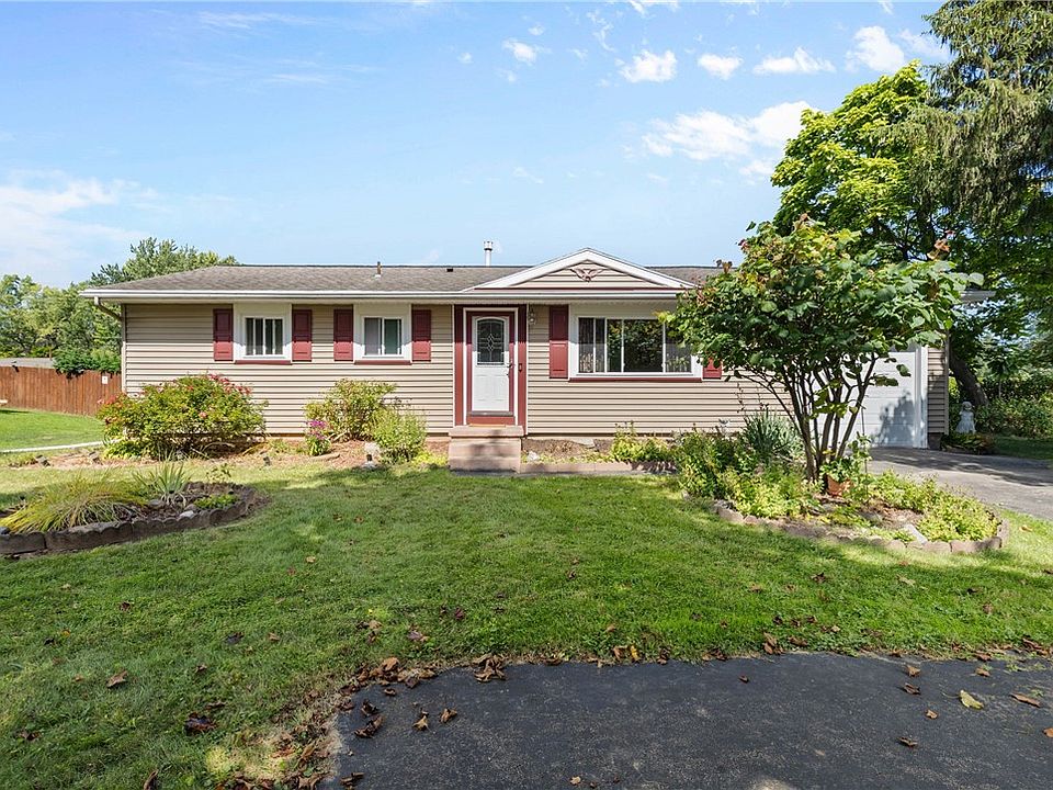 Fantastic location! This lovingly maintained ranch offers three bedrooms, one and a half bathrooms, and a bright, spacious living room with gleaming hardwood floors throughout. The large kitchen flows beautifully into an inviting bonus room at the back of the home, perfect for entertaining or relaxing. A partially finished basement adds valuable extra living space, while the fenced backyard provides privacy with a custom patio for outdoor enjoyment. Nestled on the Pittsford/Rush-Henrietta border, this home offers both comfort and convenience—easy living at its best!