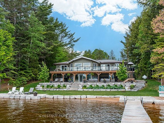 Discover the ultimate in Haliburton Lake luxury living with this exceptional waterfront home for sale in the heart of cottage country. This stunning year-round residence or getaway offers 2,850 sq. ft. of refined living space on a level, treed 1.1-acre lot with 100 feet of sandy shoreline and crystal-clear water - perfect for swimming, boating, and fishing. Enjoy panoramic lake views, tranquil sunrise vistas, and the rare combination of shallow entry and deep water off the dock. The 4+1 bedroom, 3 bathroom layout features cathedral ceilings, hardwood floors, two propane fireplaces, and multiple walkouts to a 60-foot lakeside patio ideal for entertaining. The chef's kitchen, open-concept design, and bright living areas make this home ideal for hosting family and friends. Outside, you'll find beautiful perennial gardens, a fitness/games room, and a 3-car garage (one bay insulated and heated). Comfort features include central air, central vac, high-efficiency propane furnace, and a backup generator for peace of mind. This Haliburton waterfront property is located on one of the area's most prestigious lakes, offering privacy, easy year-round access, and endless recreational opportunities. A rare opportunity in Haliburton real estate - schedule your private showing today and experience lakeside luxury at its finest.