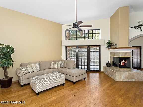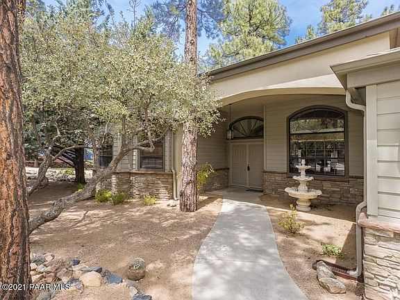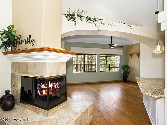 A GEM IN THE PINES - Nestled in the towering Ponderosas of Timber Ridge, one of Prescott's most idyllic and established communities! This rare single-level home offers an open split floorplan made bright by skylights and space-enhancing vaulted ceilings. Covered entry with double doors, arched windows, and fountain will charm your guests on arrival. A spacious living room, dining area, and a handy flex space adjacent to the kitchen provide plenty of options for entertaining and day-to-day living arrangements. Eye-catching architectural details and a 3-sided fireplace create inviting ambience to be enjoyed from multiple vantage points. An efficiently designed kitchen features white cabinetry accented by glass paneled door fronts, extensive granite countertops, contemporary