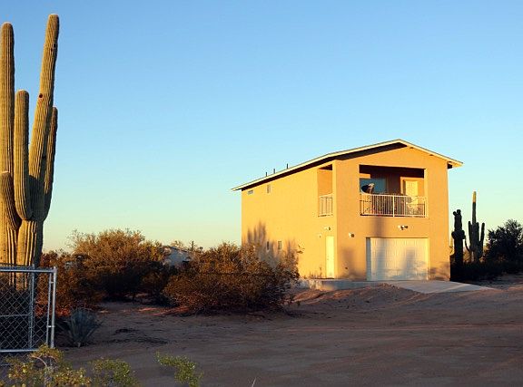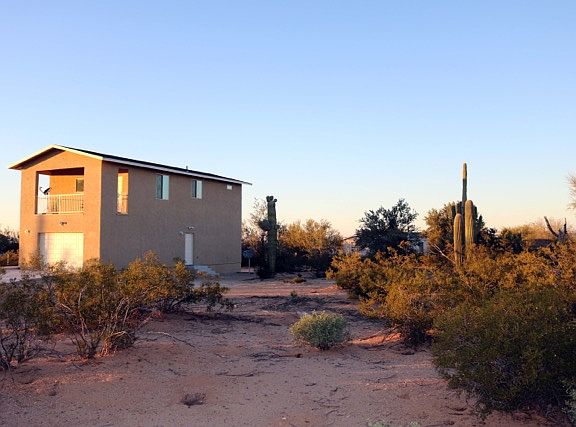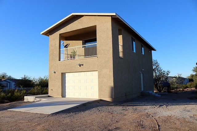 Amazing custom home built in 2017 on a fenced acre lot with mature saguaros and panoramic views of Picture Rock, Saguaro National Park and Picacho Peak. You won't find anything like it in the area! This house includes beautiful newly remodeled upstairs kitchen with stainless steel appliances and butcher board counter tops, one bedroom, a full bathroom and a living room. Enjoy the breathtaking Arizona sunsets from the upstairs 144 sq ft balcony. The downstairs area includes two large rooms, a half bath and the laundry room. Don't miss out on this amazing, unique home!