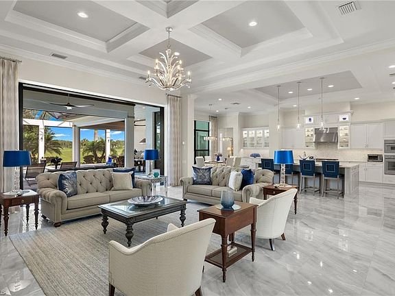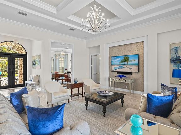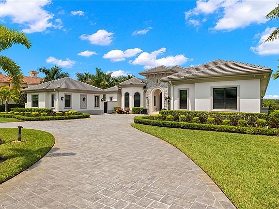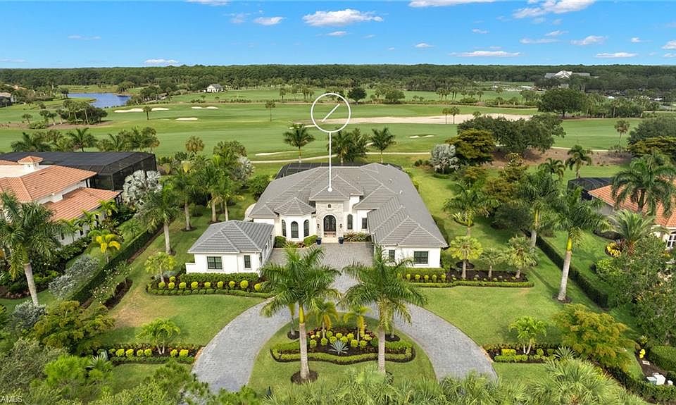 Welcome to 11681 Bald Eagle Way, a stunning custom-built home by Arthur Rutenberg, located on a private street overlooking the 9th fairway of the prestigious Talon Golf Course. This elegant residence sits on a spacious 1-acre lot, offering privacy and breathtaking views. As you approach the property you are met with a large circular driveway, providing a grand entrance and ample parking space for residents and guests alike. Boasting 5 bedrooms and 6 baths, including 4 full ensuites, this home exudes luxury and sophistication. As you step inside through the double iron door entry, you'll be greeted by a grand interior featuring vaulted coffered ceilings, creating an ambiance of modern elegance. The kitchen is a chef's dream, equipped with Thermador appliances, a gas 6-burner stove, a large island, expanded cabinets with under cabinet lighting, and a wine/beverage cooler. The butler's pantry adds a touch of convenience and functionality to the space. Whether you're hosting a dinner party or enjoying a cozy meal with loved ones, this kitchen is sure to impress. Relax at the end of the day in your serene master suite with dual vanities, a soaking tub, separate shower and his/her closets. The outdoor area is a true oasis, featuring a saltwater pool with electric and gas heat, a spa, water bowl features, a fountain, and a sun shelf. The large outdoor kitchen equipped with a gas grill and bar is perfect for entertaining, while the wood ceilings in the outdoor living space add a touch of warmth and sophistication. Automatic roll-down shade/storm screens provide both comfort and convenience. In addition to its impressive features, this home includes an attached Casita with a private courtyard, adds a layer of versatility to the home, catering to a range of lifestyle requirements. This home is situated on an oversized lot with desirable western exposure, allowing you to enjoy beautiful sunsets and ample natural light. Twin Eagles is one of the finest communities in SWFL, experience 1,115 acres of natural tranquility, 2 Championship Golf Courses- Talon course designed by the Nicklaus Group and The Eagle Course designed by Steve Smyers. New Clubhouse, bocce Courts, Himalayan putting green, Fitness Center, Tennis, Pickleball, resort pool and tiki bar. Immediate FULL GOLF Membership available!