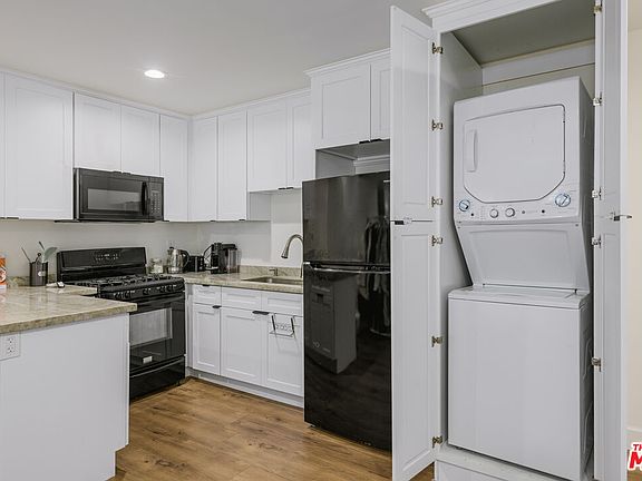 Move-in ready studio in a well-kept multifamily building near the NoHo Arts District. Open layout with recessed lighting, durable plank floors, dual-pane windows, and A/C & heat unit. Equipped with shaker cabinets, granite-style counters, gas range, microwave, dishwasher, full-size fridge, and a peninsula for casual dining. Stacked in-unit washer/dryer is neatly built in. Updated bath with modern vanity and glass-enclosed shower. Enjoy the gated courtyard patio, perfect for morning coffee and shared access to a sparkling pool with lounge areas. Convenient street parking and easy access to dining, shopping, freeways, and Metro.