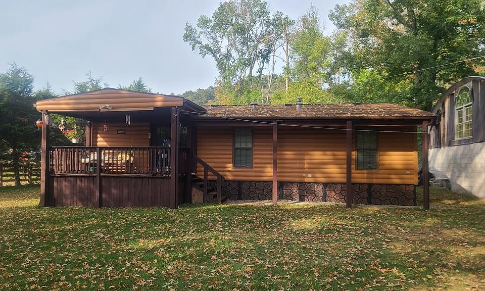 Private settingSeveral outbuildingsCovered front porchLog style manufactured home