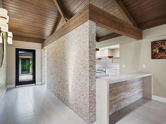 Secluded outdoor showerElegant paversVaulted open-beam ceilingsContemporary quartz countertopsNatural lightFully screened back patioSliding glass doors