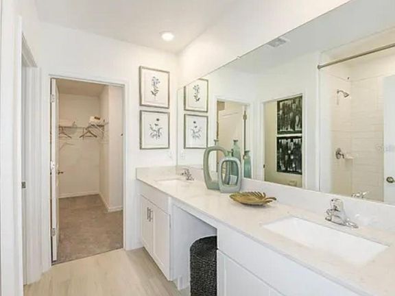 Let's start with the bedroom, where you will find a comfortable queen-sized bed, two nightstands, and a dresser. A smart tv and ceiling fan provide entertainment and keep the room cool and breezy. The bathroom boosts a convenient stand-up shower, a double vanity, a private toilet, and a spacious walk in closet.