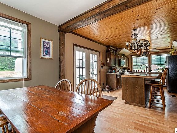 Mini Farm setting on almost 5 acres with a small pond with a mote! 30X40 Pole Barn, 2 chicken houses, a small barn and some fenced in pens. 2+ acres of woods for deer hunting and plenty of wood for the wood furnace or camp fires. This 2 story home features 4 bedrooms with one on the man level. A eat in kitchen at the bar with dinning in the same room. Mechanical and cosmetic updates!