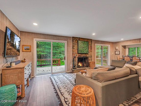 Ductless air conditioning. 2024 improvements include a completely renovated kitchen, new roof, windows and exterior paint. Superb private outdoor living with a delightful, spacious screened porch, extensive decking and firepit area. A well-loved furnished Pocono getaway that accents nature and tranquility amidst first-class amenities and an array of year-round attractions. Move in appeal to enjoy this winter.