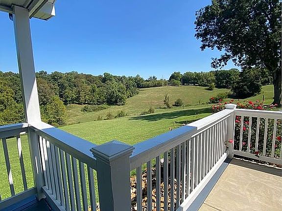 • Covered porch accessible from both the kitchen and master bedroom, overlooking rolling farmland and shaded by walnut and acorn trees.