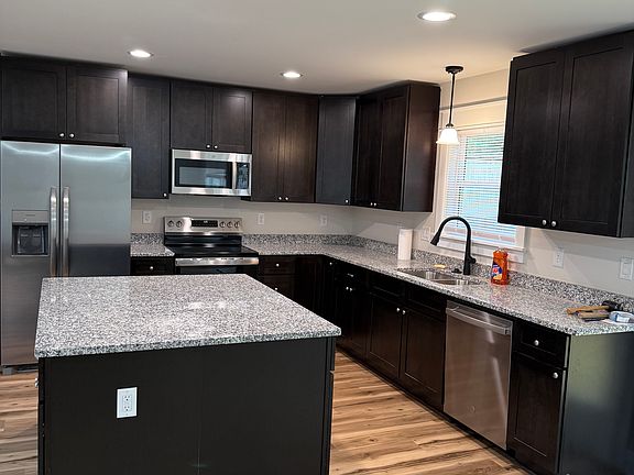 New kitchen appliances including fridge, oven/stove, dishwasher and microwave with new cabinets and granite island counter.
