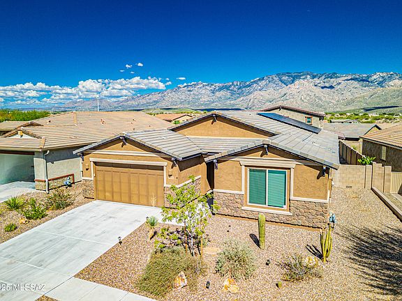 Finally! The wait is over! This beautifully upgraded 3 bedroom, 3 bathroom, 3 car garage, 3 year old home with FULLY OWNED solar panels has been waiting for you in the highly sought after Villages at Silverhawke in Oro Valley! This 2342 sqft energy-efficient home with spray-foam insulation throughout, is full of luxury upgrades! Your gourmet kitchen features extensive countertop space of lovely quartz, along with beautiful cabinets, a massive pantry, gas stove top, and Kitchen Aid stainless appliances. The extended living room option provides a pocket office with cabinet space. Your upgraded primary suite offers a large bedroom and luxury bathroom complete with spacious clothes closet, additional large linen closet, private toilet, extended double sink quartz countertop, and beautifully upgraded "super shower" with tile and bench. Your massive laundry room provides multiple cabinets, utility sink, plenty of countertop space, and washer and dryer still under warranty. Enjoy stunning views of the Santa Catalina Mountains from your east-facing backyard, which also gives you a lemon tree, a grapefruit tree, a lime tree, a mandarin tree, cactus, artificial turf, and a side yard. But wait! There's more! This home is fully wired for ADT security, and all sensors convey! The owners entry off of the 3-car tandem fully-finished garage provides a "drop off" space with countertop and additional cabinets. Large walk-in closets in all 3 bedrooms! Double sink vanity in full hallway bathroom! In addition, this home features natural light throughout, cabinets and extra storage space throughout, and all upgraded tile flooring throughout the home except for the 3 bedrooms, which feature upgraded carpet. All window coverings and blinds stay! All appliances stay, including refrigerator, washer, and dryer! Beautiful saguaro cacti and yucca in front yard! But don't forget about the area: This gated community features a lovely park and walking trails throughout! Cycle, jog, or walk your dog along the Chuck Huckleberry Loop, which runs alongside your neighborhood off of 1st Avenue! Here, you will be minutes from groceries, restaurants, pharmacies, businesses, clinics, Oro Valley Marketplace, a hospital, and much more! Make this beautiful house your home-TODAY!